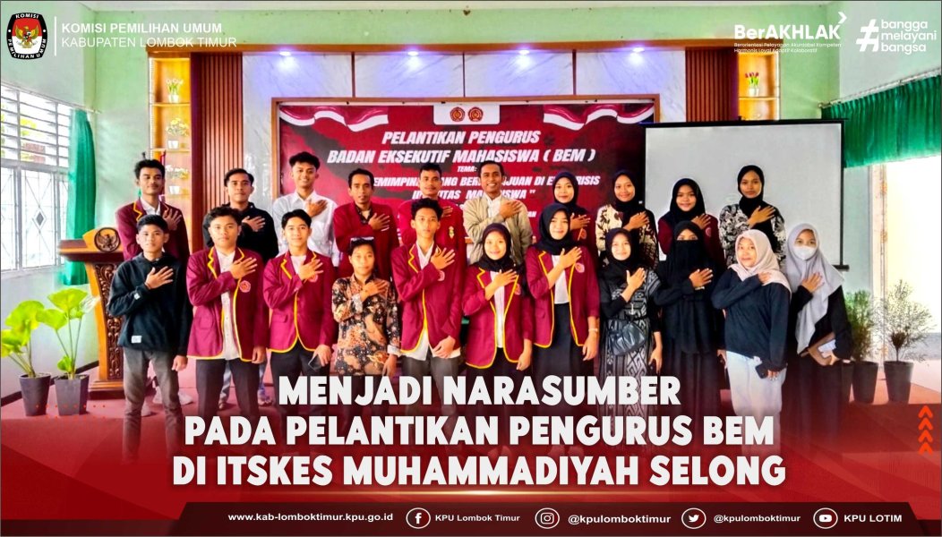 KPU Kabupaten Lombok Timur melalui Ketua Divisi Perencanaan, Data, dan Informasi, Suriadi, S.Sy., M.E, menghadiri Pelantikan Pengurus Badan Eksekutif Mahasiswa (BEM) ITSKES Muhammadiyah Selong Periode 2025-2026 yang berlangsung di Aula Kampus ITSKES Muhammadiyah Selong, Selasa 9 September 2025.