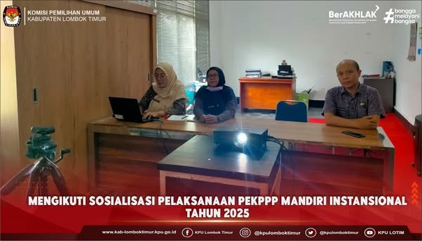Komisi Pemilihan Umum (KPU) Kabupaten Lombok Timur mengikuti kegiatan sosialisasi pelaksanaan Pemantauan dan Evaluasi Kinerja Penyelenggaraan Pelayanan Publik (PEKPPP) Mandiri Instansional Tahun 2025. Kegiatan ini diselenggarakan oleh KPU RI secara daring pada Kamis, 18 September 2025.