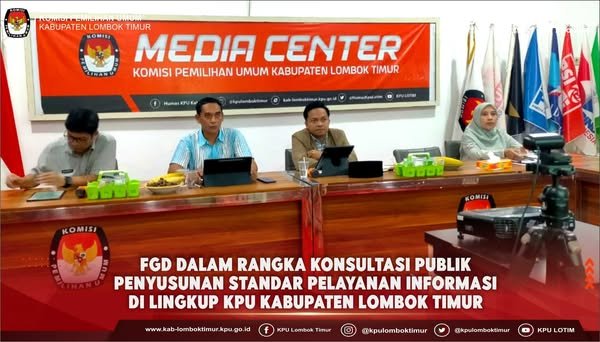 Komisi Pemilihan Umum (KPU) Kabupaten Lombok Timur menggelar kegiatan FGD dalam rangka konsultasi publik penyusunan Standar Pelayanan Informasi di lingkup KPU Kabupaten Lombok Timur, Jumat (19/9/2025). Kegiatan yang bertempat di Ruang Media Center KPU Kabupaten Lombok Timur ini dilaksanakan secara daring.