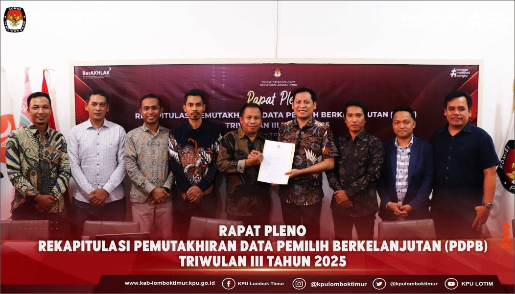 Komisi Pemilihan Umum (KPU) Kabupaten Lombok Timur melaksanakan kegiatan Rapat Pleno Rekapitulasi Pemutakhiran Data Pemilih Berkelanjutan (PDPB) Triwulan III tahun 2025, Kamis 2 Oktober 2025.