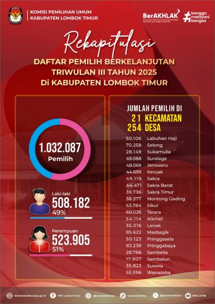 Berikut Infografis Rekapitulasi Daftar Pemilih Berkelanjutan Triwulan III Tahun 2025 di Kabupaten Lombok Timur.