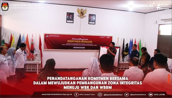Komisi Pemilihan Umum (KPU) Kabupaten Lombok Timur melaksanakan kegiatan penandatanganan komitmen bersama pembangunan Zona Integritas menuju Wilayah Bebas dari Korupsi (WBK) dan Wilayah Birokrasi Bersih dan Melayani (WBBM), Kamis 30 Oktober 2025.