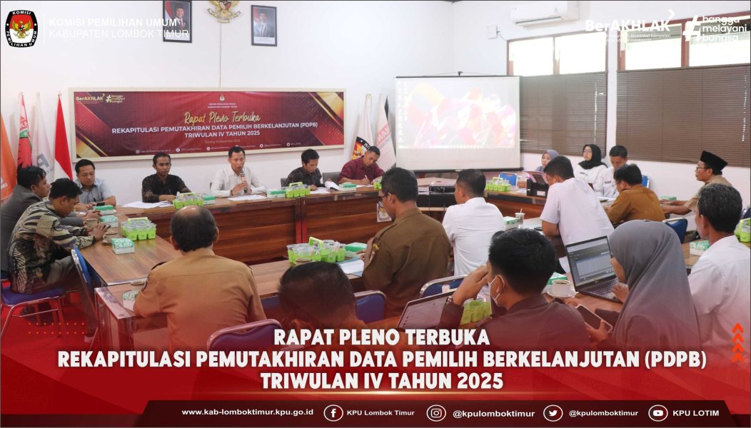 Komisi Pemilihan Umum (KPU) Kabupaten Lombok Timur melaksanakan kegiatan Rapat Pleno Terbuka Rekapitulasi Pemutakhiran Data Pemilih Berkelanjutan (PDPB) Triwulan IV tahun 2025, Senin 8 Desember 2025.