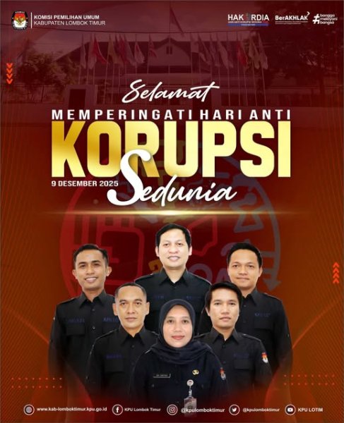 Segenap Keluarga Besar KPU Kabupaten Lombok Timur Mengucapkan Selamat Memperingati Hari Anti Korupsi Sedunia tahun 2025, 9 Desember 2025.