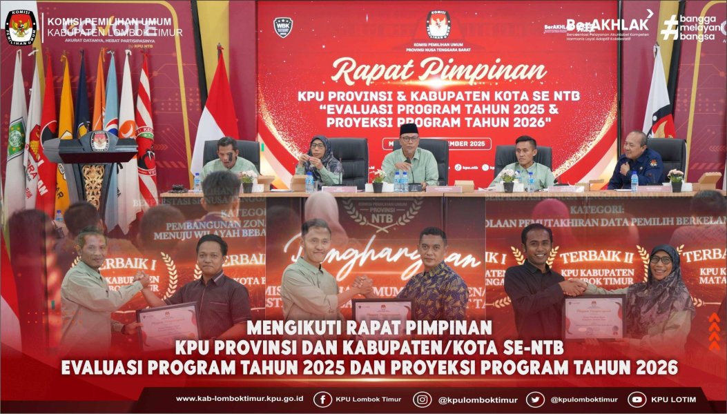 Komisi Pemilihan Umum (KPU) Kabupaten Lombok Timur mengikuti Rapat Pimpinan KPU Provinsi dan Kabupaten/Kota Se-NTB yang mengusung tema “Evaluasi Program Tahun 2025 dan Proyeksi Program Tahun 2026”, Minggu 14 Desember 2025.