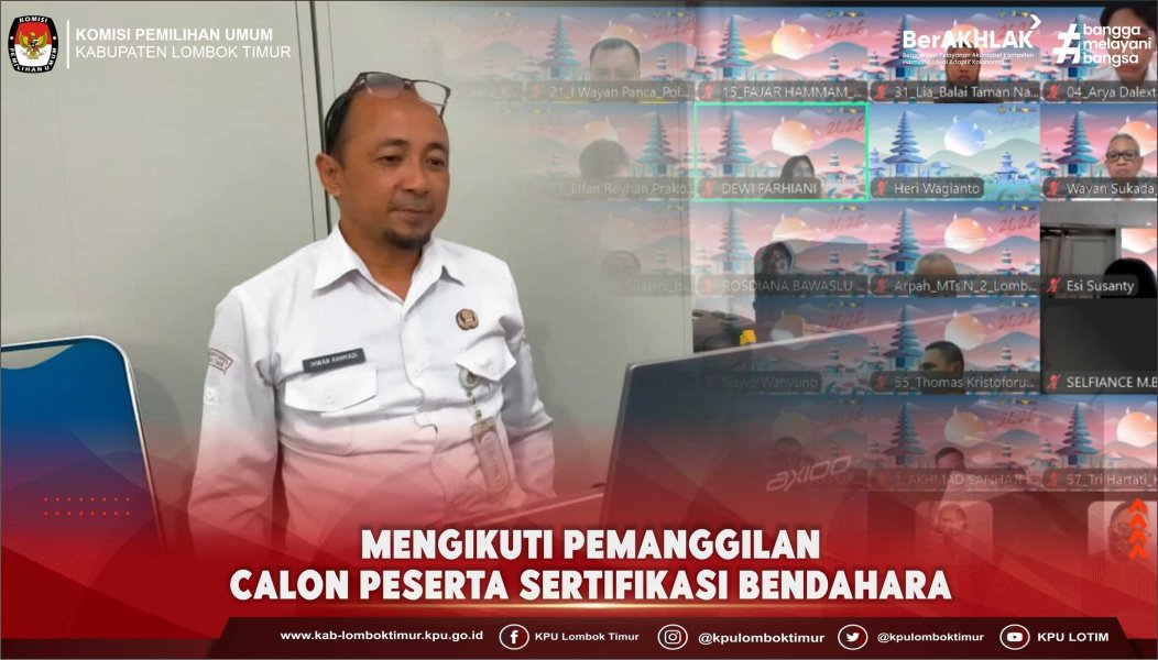 Komisi Pemilihan Umum (KPU) Kabupaten Lombok Timur mengikuti kegiatan pemanggilan calon peserta sertifikasi bendahara yang diselnggarakn oleh Balai Diklat Keuangan Danpasar secara daring, pada Senin, 9 Februari 2026.