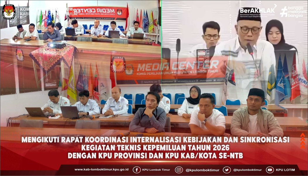 Komisi Pemilihan Umum (KPU) Kabupaten Lombok Timur mengikuti Rapat Koordinasi Internalisasi Kebijakan dan Sinkronisasi Kegiatan Teknis Kepemiluan Tahun 2026 dengan KPU Provinsi dan KPU Kab/Kota se-NTB secara daring, Senin 23 Februari 2026.