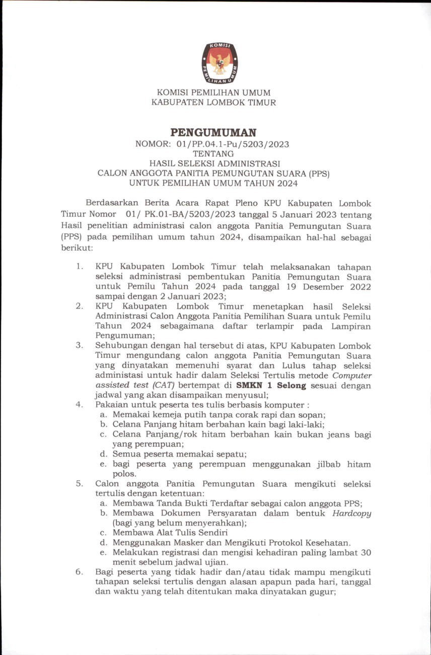 Berikut Kami Informasikan Hasil Seleksi Administrasi Calon Anggota Panitia Pemungutan Suara (PPS) pada Pemilu tahun 2024.