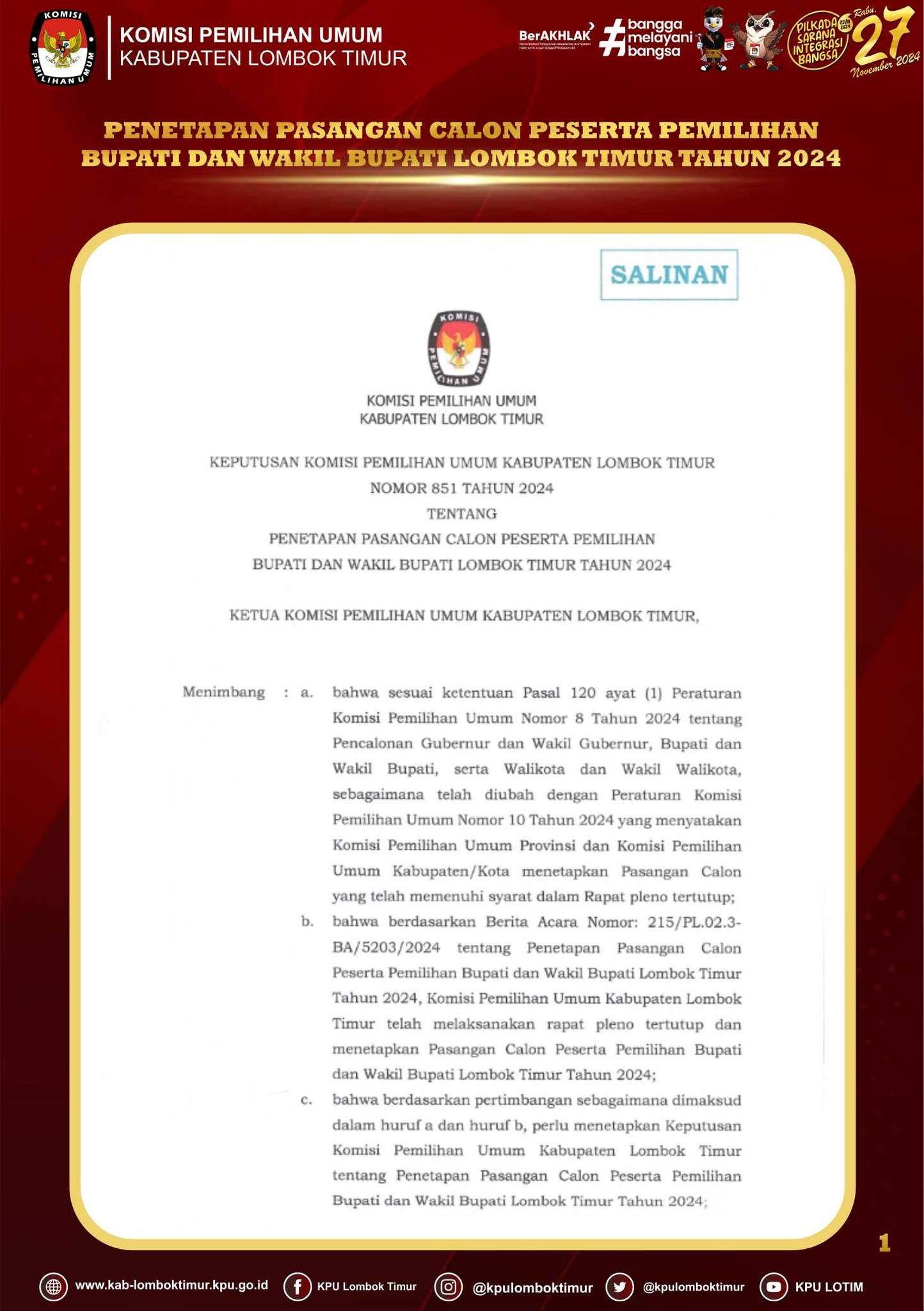 Berikut Penetapan Pasangan Calon Peserta Pemilihan Bupati dan Wakil Bupati Lombok Timur tahun 2024.