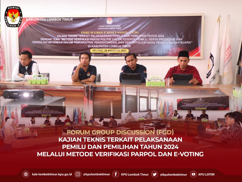 Menindaklanjuti surat KPU RI Nomor 1109/PL01-SD/06/2025 tanggal 26 Juni 2025 perihal Penjelasan Pelaksanaan Kegiatan Pasca Pemilu dan Pemilihan, KPU Kabupaten Lombok Timur menggelar Forum Group Discussion (FGD) internal dengan dua tema utama, yaitu Metode Verifikasi Partai Politik Calon Peserta Pemilu serta Prosedur dan Teknologi Informasi dalam Pemungutan, Penghitungan, dan Rekapitulasi Hasil Penghitungan Suara yang mencakup: Early Voting, e/i-Voting, e/i-Counting, dan e/i-Recapitulation.