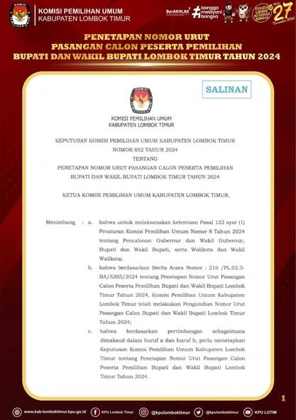 Berikut Keputusan KPU Kabupaten Lombok Timur Nomor 852 tahun 2024 tentang Penetapan Nomor Urut Pasangan Calon Peserta Pemilihan Bupati dan Wakil Bupati Lombok Timur tahun 2024. Selengkapnya
