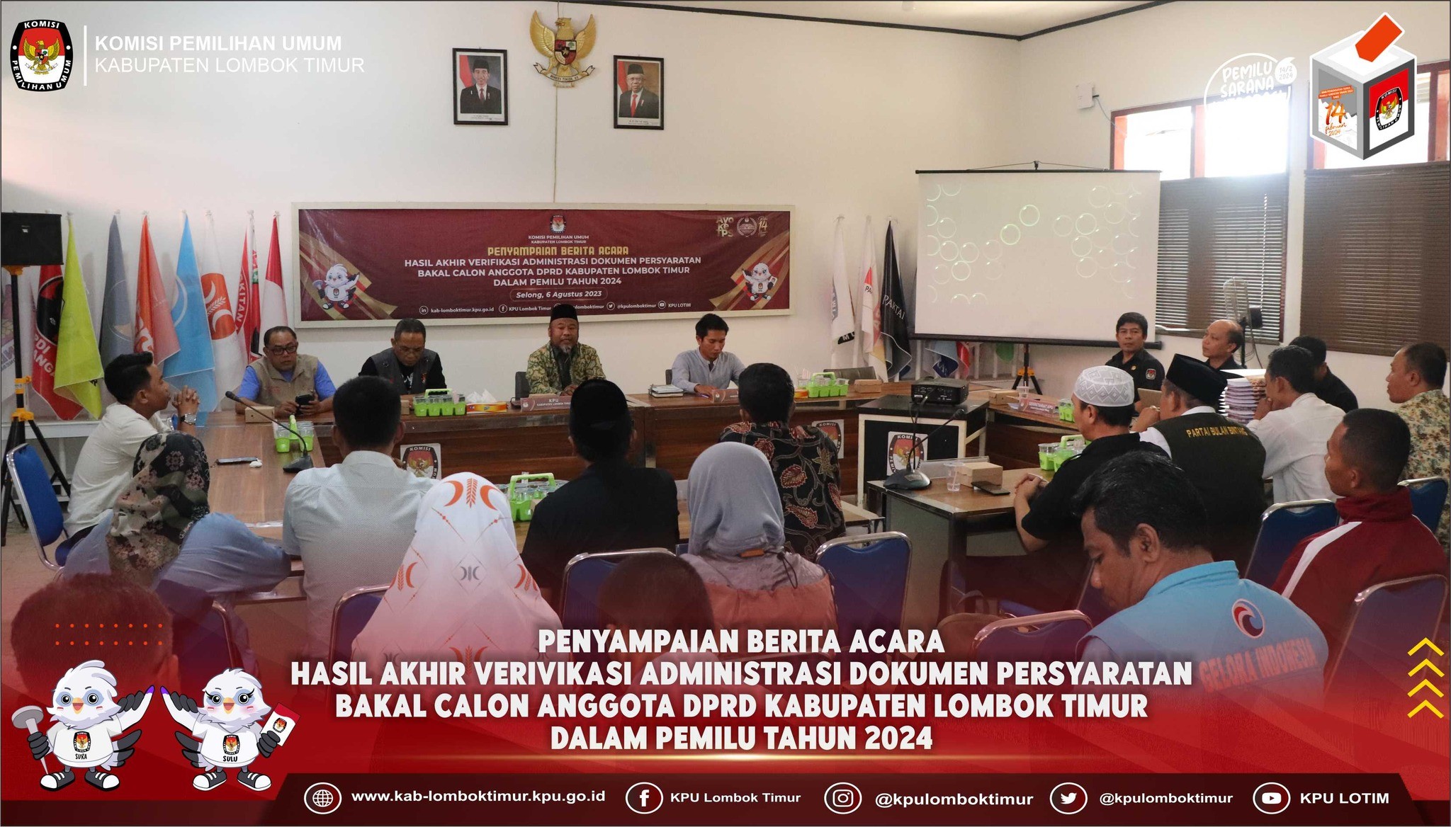 (KPU) Kabupaten Lombok Timur melaksanakan kegiatan Penyampaian Berita Acara Hasil Akhir Verifikasi Administrasi Dokumen Persyaratan Bakal Calon Anggota DPRD Kabupaten Lombok Timur