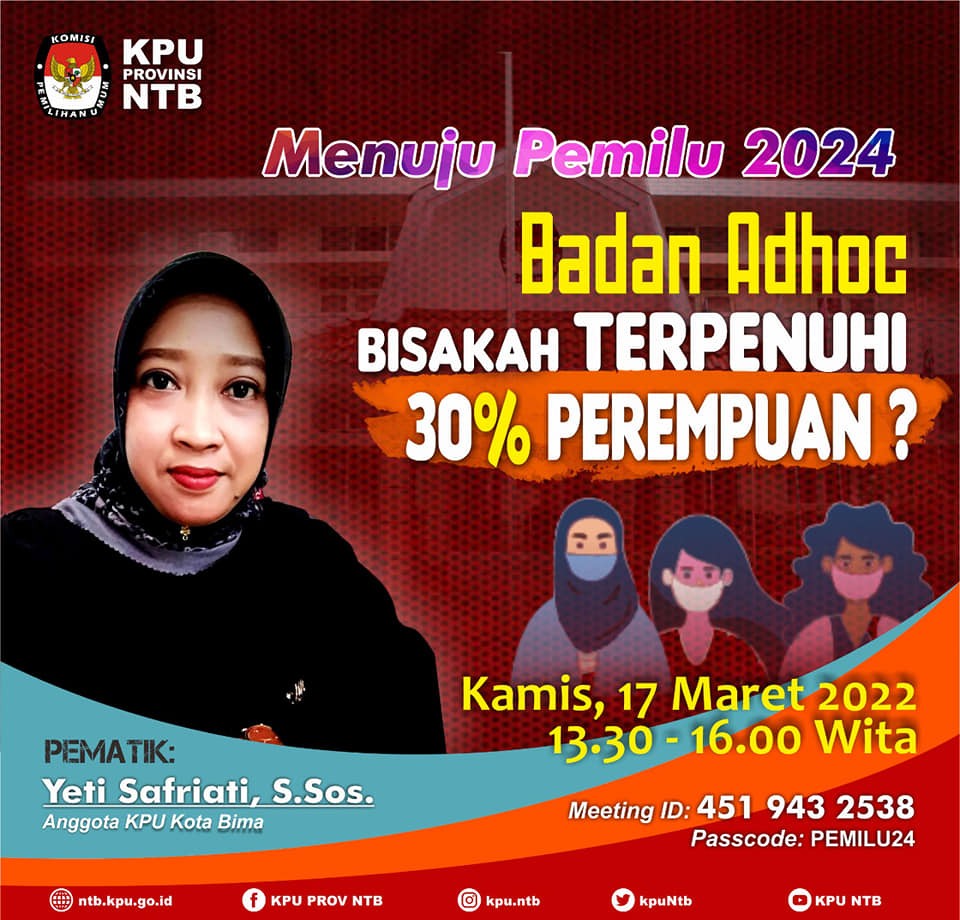 Ketua Divisi Hukum dan Pengawasan (Tuti Herawati, S.Hi. MH) dan Kasubbag Teknis Penyelenggara Pemilu, Partisipasi dan Hupmas (Roni Ardi Irmawan, S.Ap) KPU Kabupaten Lombok Timur mengikuti diskusi kajian teknis tentang Badan Ad Hoc dengan Tema Bisakah Terpenuhi 30% Perempuan?, Pada Kamis 17/3/2022.