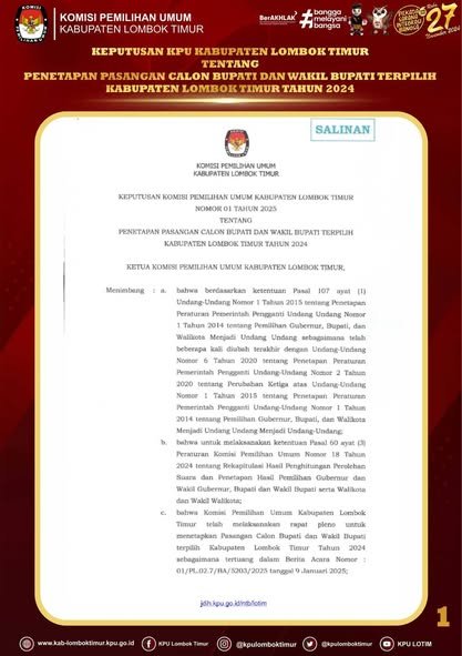 Berikut Keputusan KPU Kabupaten Lombok Timur Nomor 01 tahun 2025 tentang Penetapan Pasangan Calon Bupati dan Wakil Bupati Terpilih Kabupaten Lombok Timur tahun 2024.