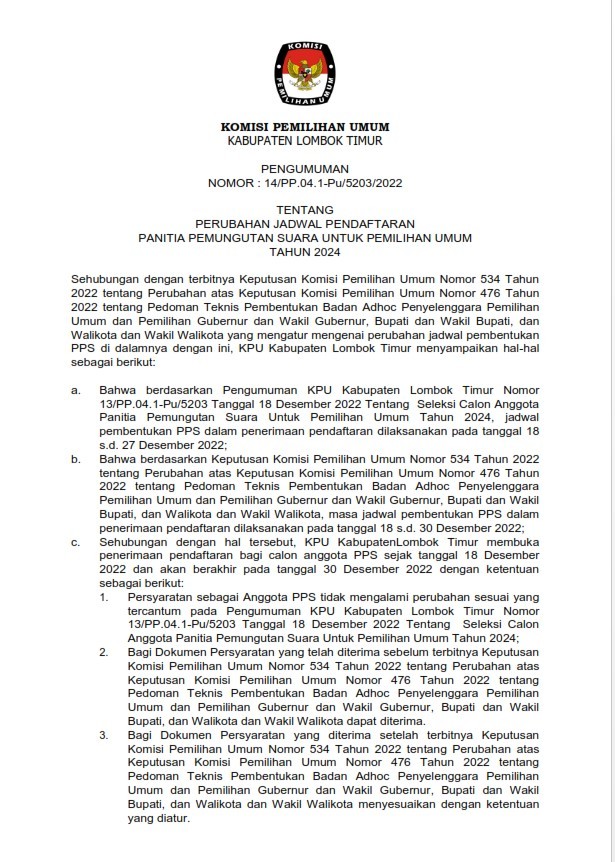 PENGUMUMAN..!!! Berikut Perubahan Jadwal Pendaftaran Panitia Pemungutan Suara (PPS) pada Pemilihan Umum tahun 2024.