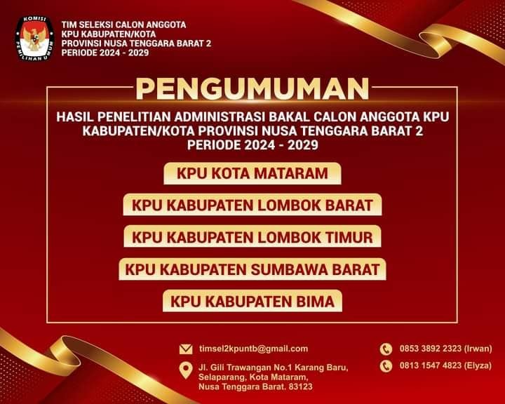 Pengumuman Hasil Penelitian Administrasi Bakal Calon Anggota KPU Kabupaten/Kota Provinsi Nusa Tenggara Barat 2 Periode 2024-2029