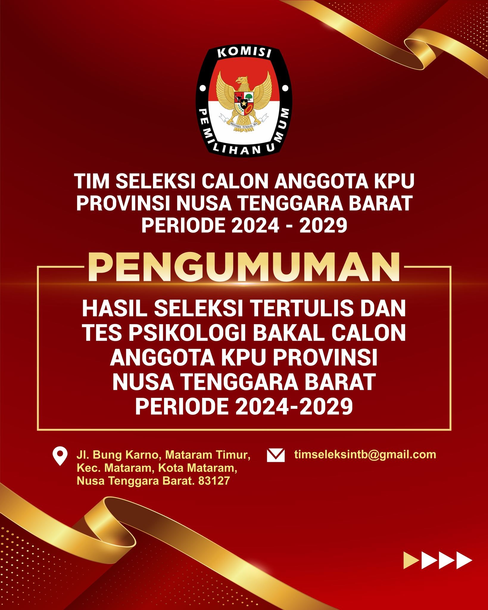PENGUMUMAN HASIL SELEKSI TERTULIS DAN TES PSIKOLOGI BAKAL CALON ANGGOTA KPU PROVINSI NUSA TENGGARA BARAT
