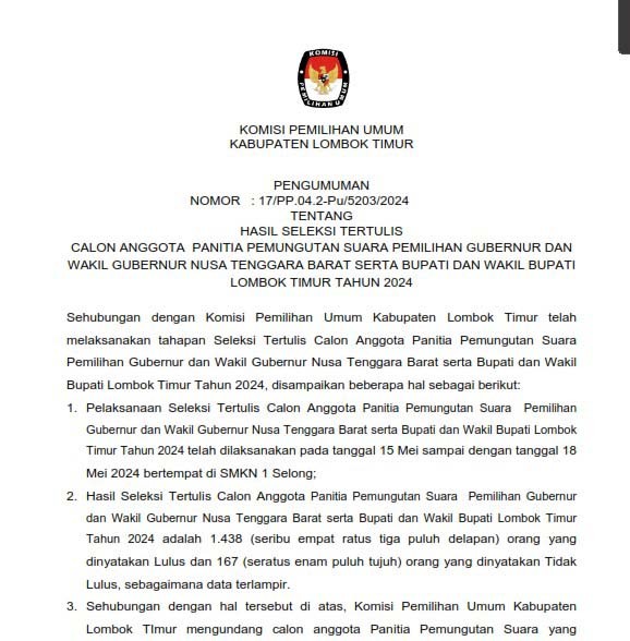 PENGUMUMAN NOMOR : 17/PP.04.2-Pu/5203/2024 Tentang Hasil Seleksi Tertulis