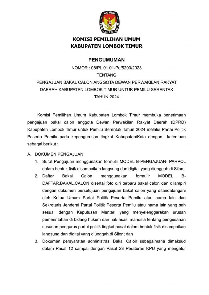 PENGUMUMAN...!!! Pengajuan Bakal Calon Anggota Dewan Perwakilan Rakyat Daerah (DPRD) Kabupaten Lombok Timur Untuk Pemilu Serentak tahun 2024