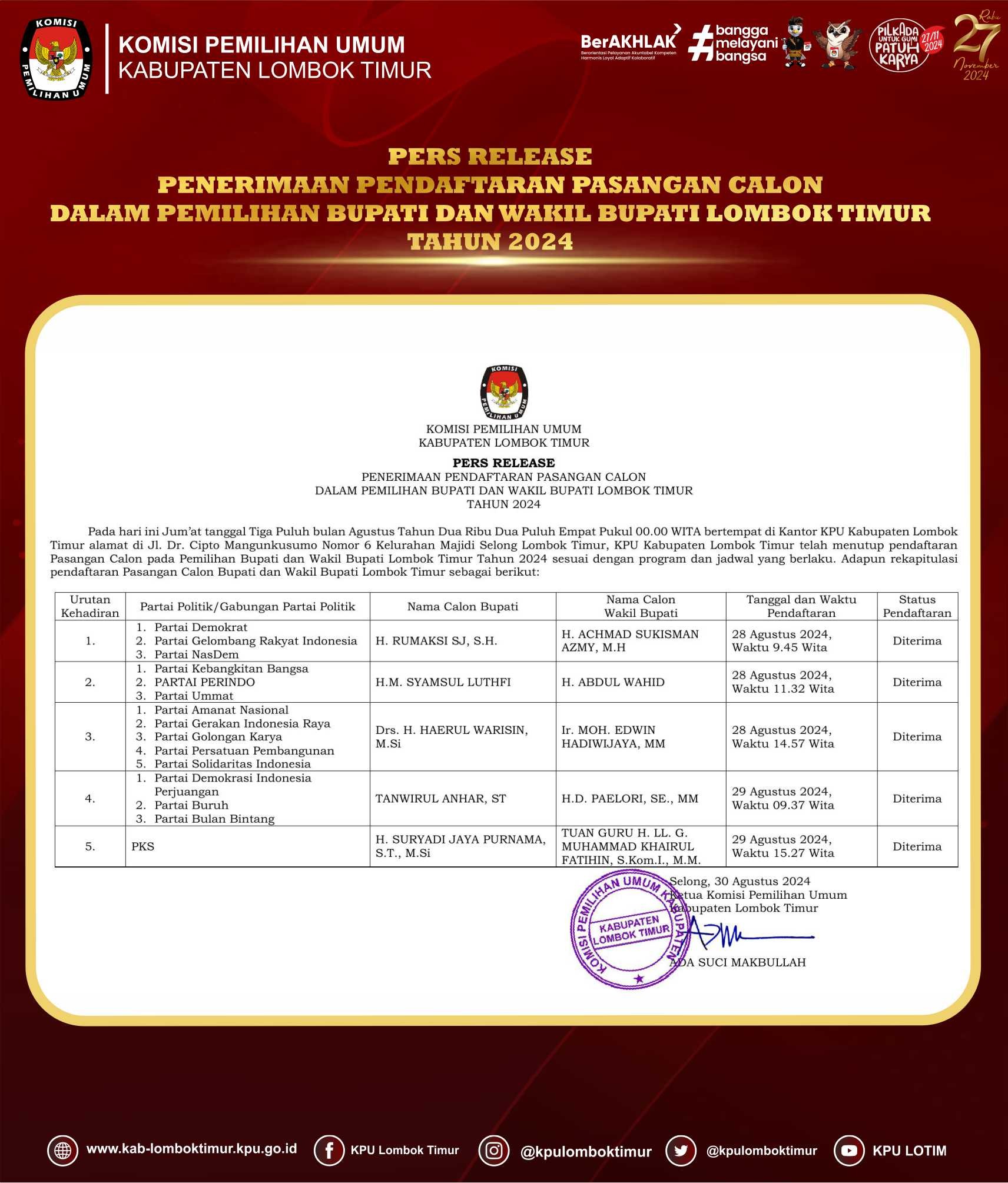 Pers Release Penerimaan Pendaftaran Pasangan Calon Dalam Pemilihan Bupati dan Wakil Bupati Lombok Timur tahun 2024